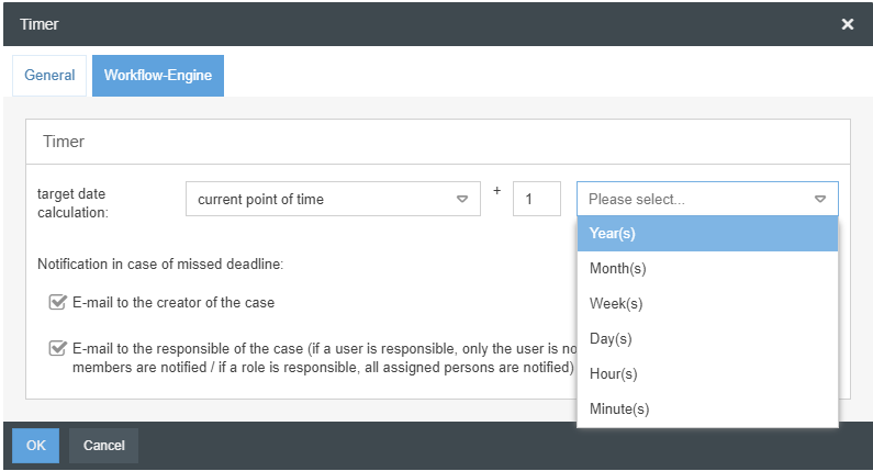 The Timer object can be used in workflows to configure deadlines, reminders and escalations. The Timer automatically calculates deadlines and can thus control the process.