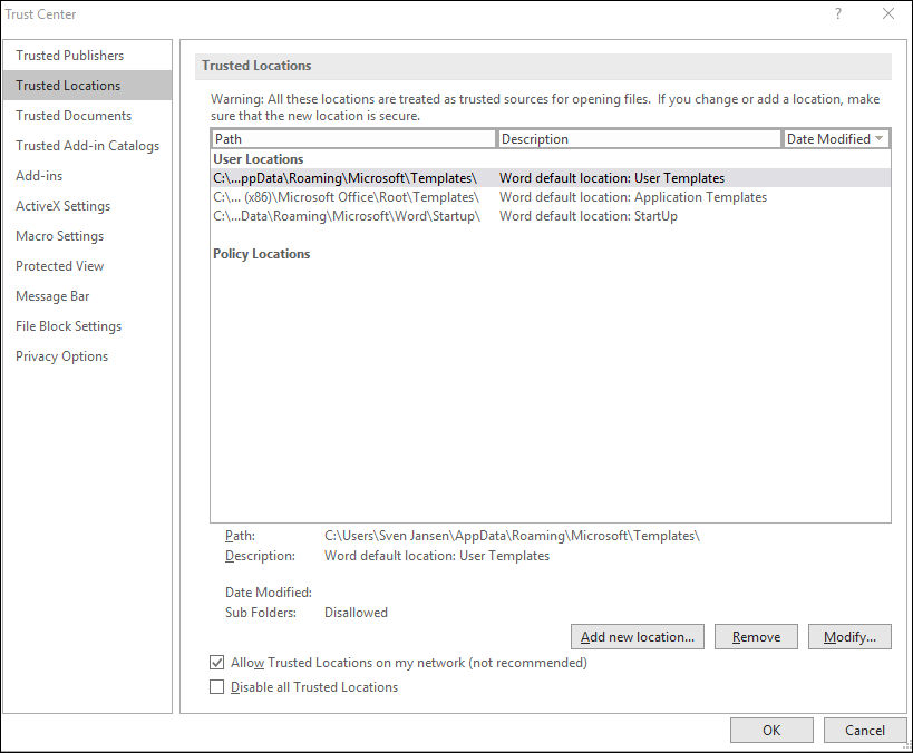 In the office program concerned (Word, Excel or PowerPoint), open "Trust Center Settings" under File > Options > Trust Center. Select the "Trusted locations" tab.
