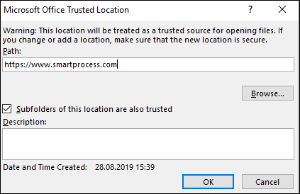 - "Subfolders of this location are also trusted" must be allowed. Confirm with <OK>.