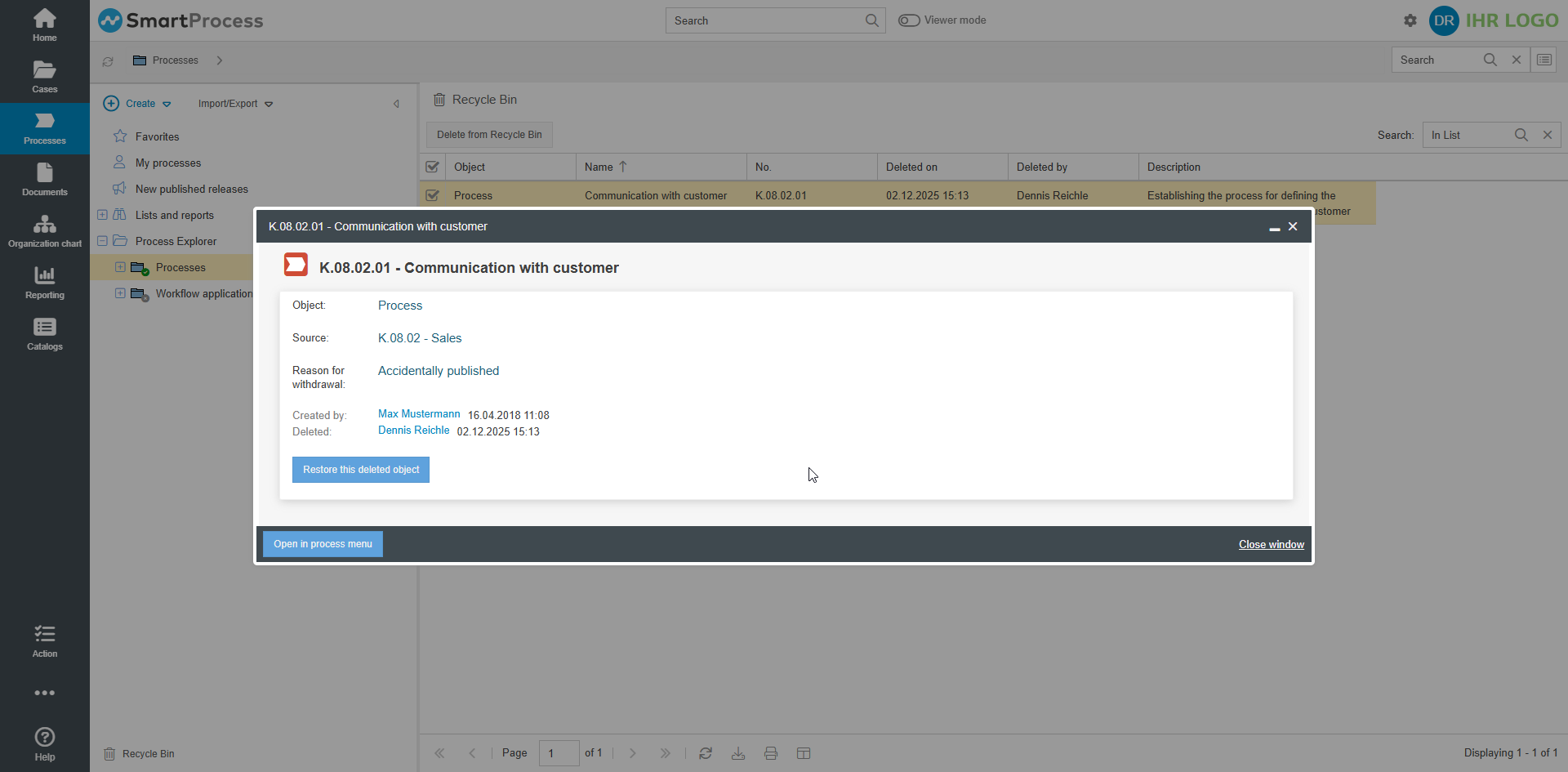 - If the publication of a process / document is withdrawn and this object is subsequently moved to the recycle bin by deleting it, the reason for withdrawing the publication is displayed in the recycle bin as long as the process / document has the state ‘Withdrawn’.