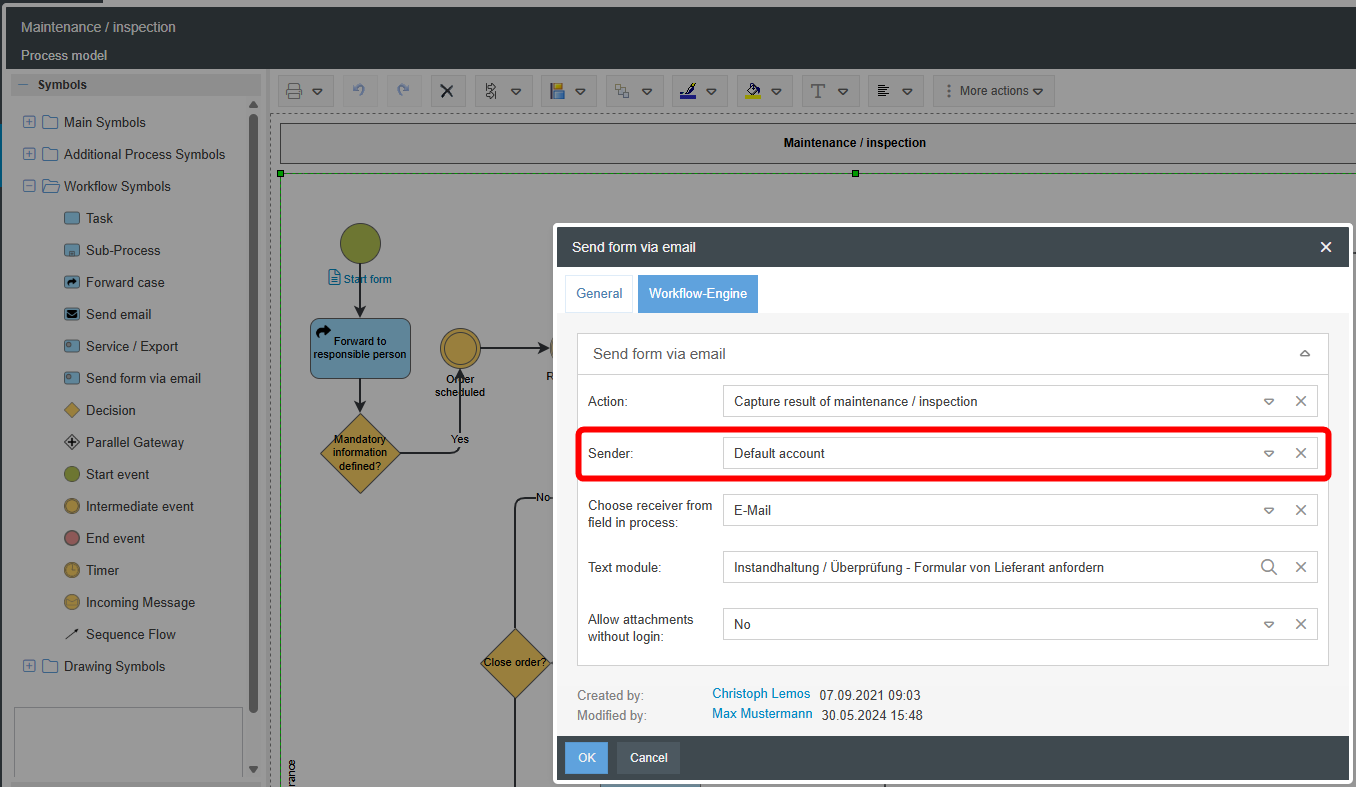 - In the Send form via Email workflow object, you can now select an individual sender account for sending the email, which was previously configured in the Email settings.