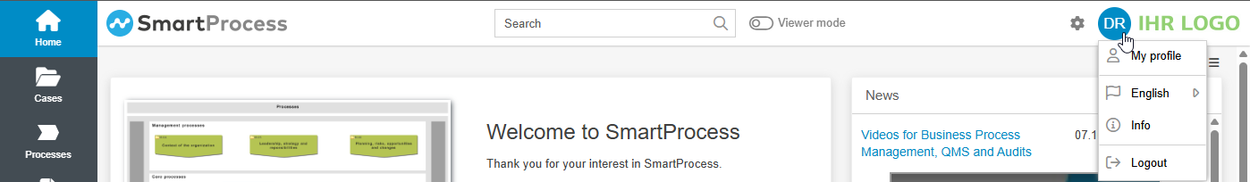 - The layout of functions in the application header has been changed. For example, the full-text search has been centered, and user options such as language selection and logout can be accessed by clicking on the user's initials or user image.