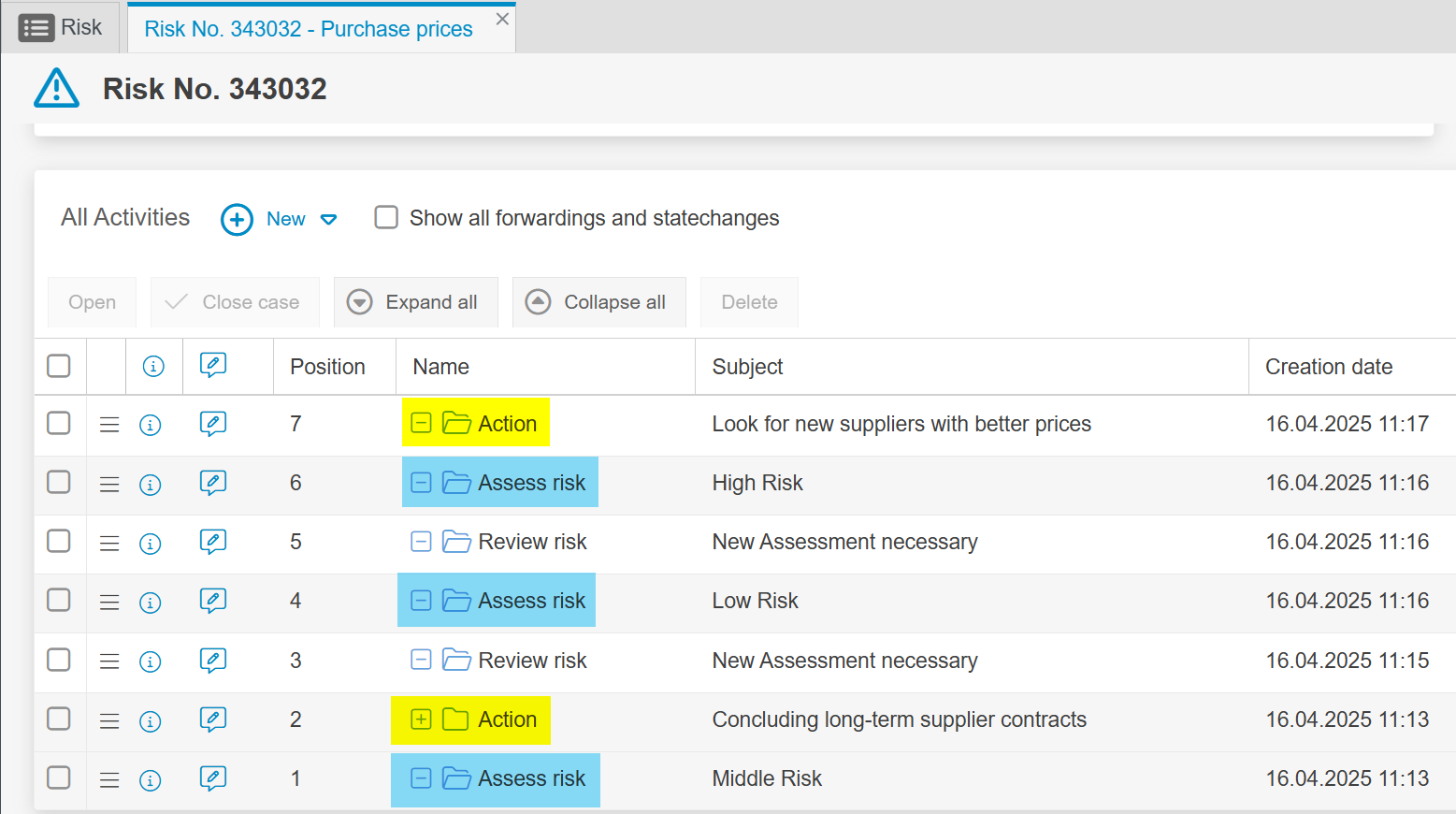 This can be shown using the example of the workflow Risk with the activities Assess risk and Action. The activity list of an exemplary risk case looks like this: