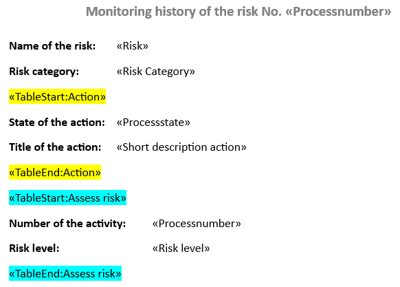 The template of a Word report, in which data from the activities Assess risk and Action are to be displayed in addition to master data from the start form of the risk, could look like this: