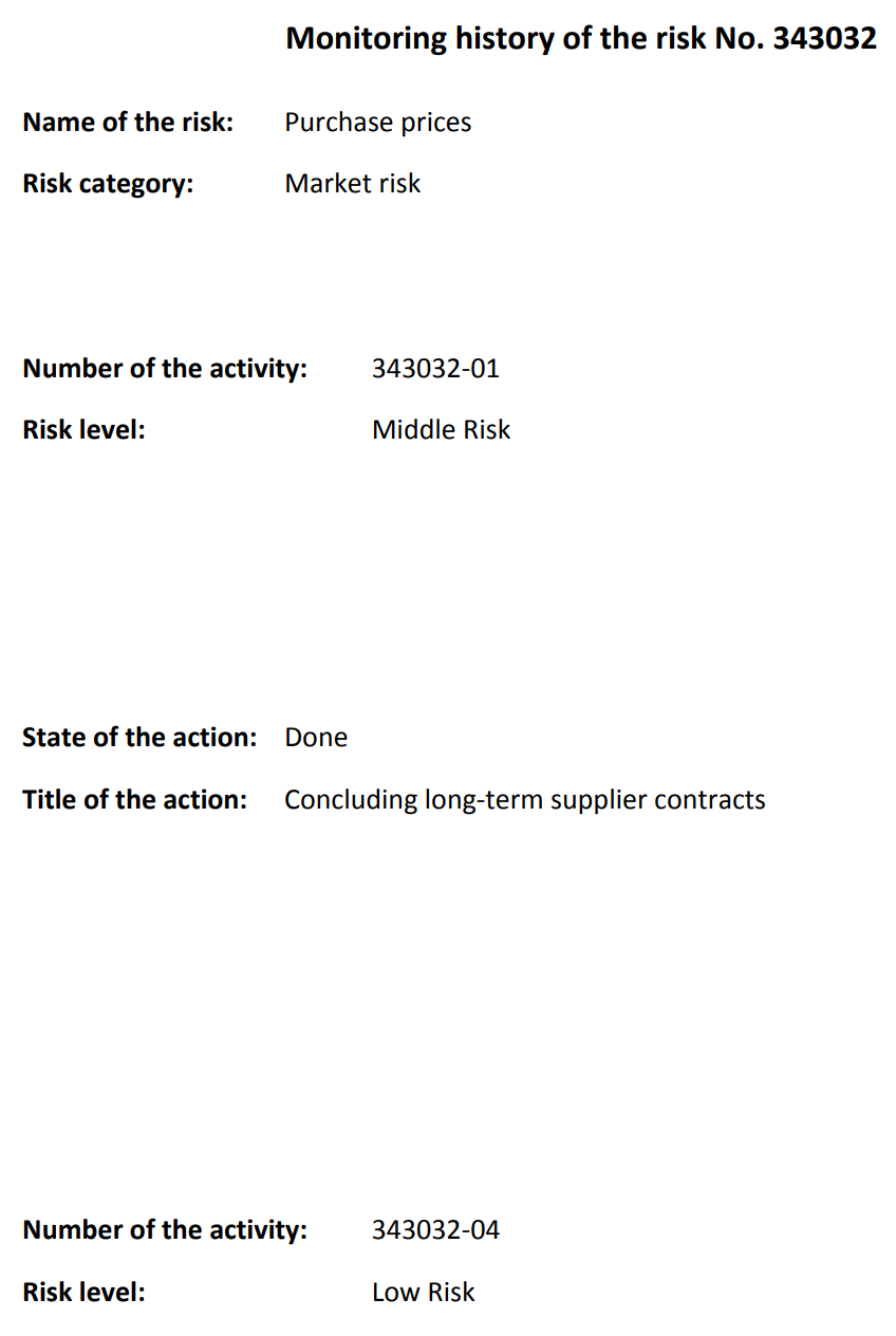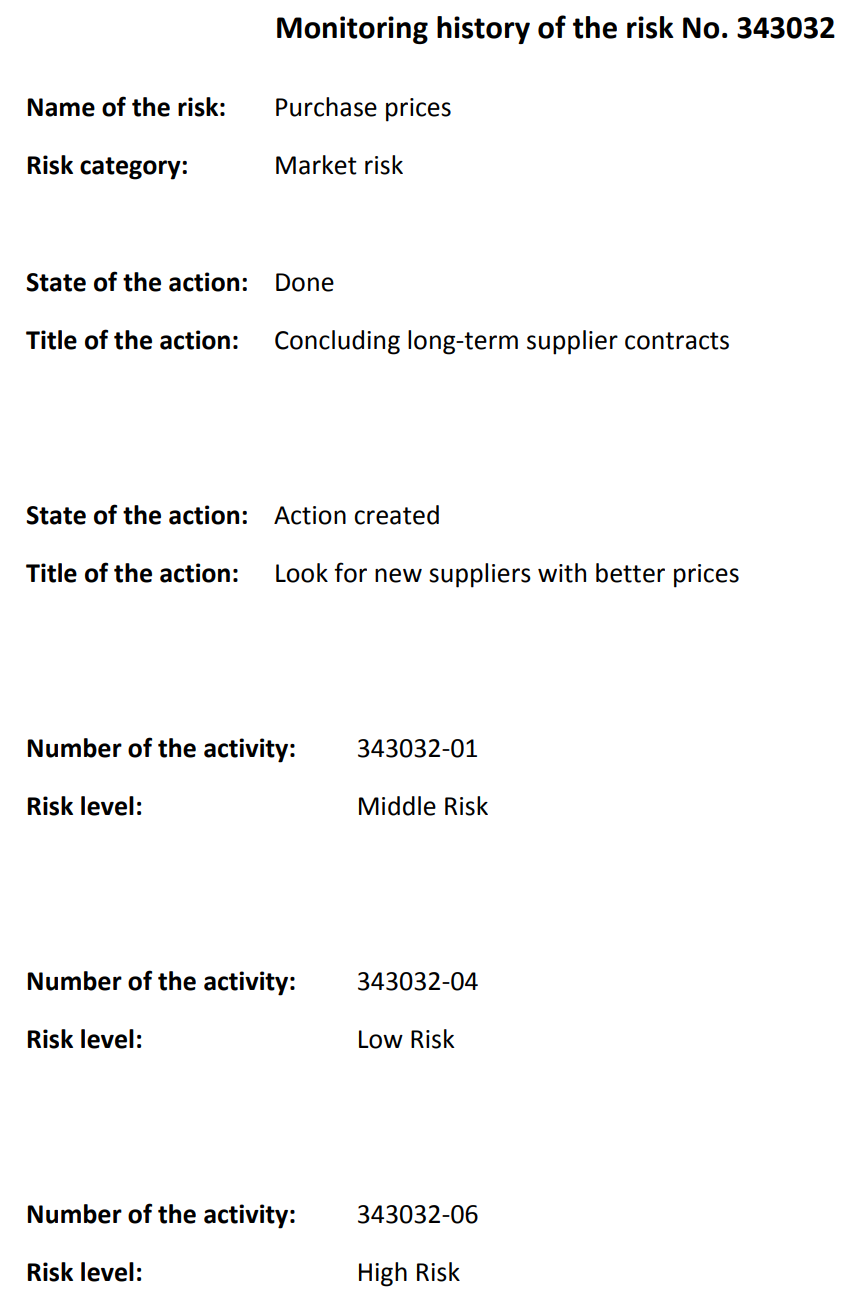 The result of this template is that the name and category of the risk from the start form are displayed once. The entire block between «TableStart:Action» and «TableEnd:Action» is then displayed for each action that exists for this risk. As there are 2 actions in the example case, this block is therefore output twice with the respective action data. Similarly, the block between «TableStart:Assess risk» and «TableEnd:Assess risk» is displayed three times because this activity exists three times in the example case.