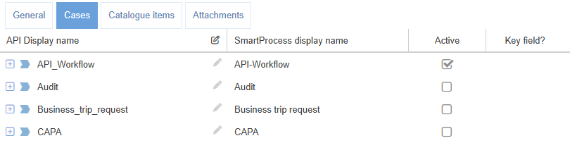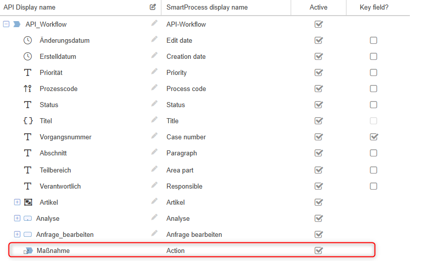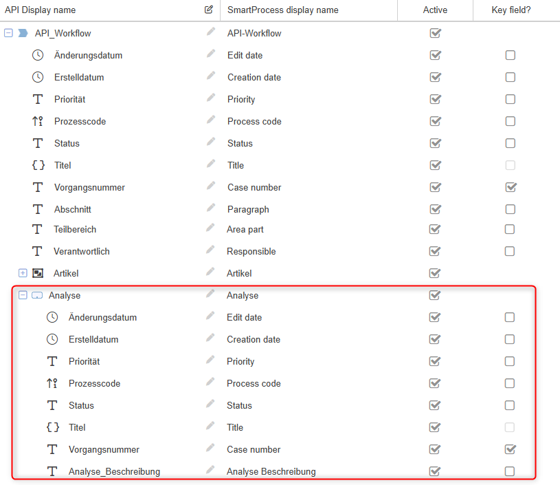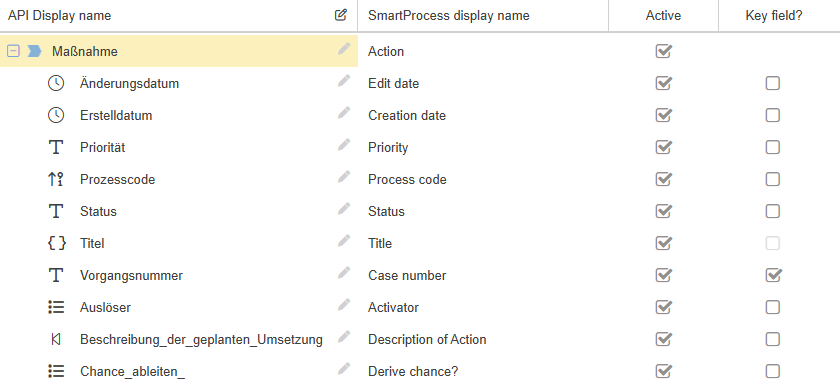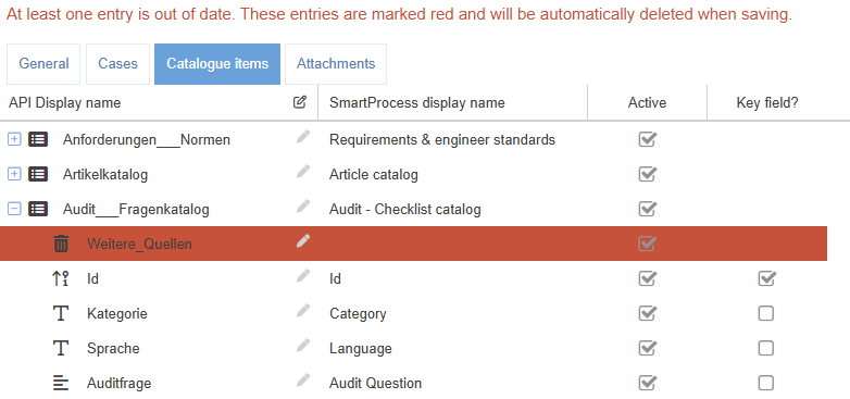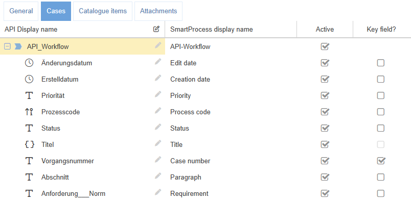 Key field? | Selection of whether the field is a key field. Each entity (cases, catalogue entries, etc.) requires at least one active key field that uniquely identifies it. A key field must always be selected as active! |