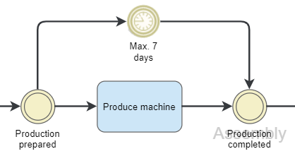 Timer![]() | The Timer object is used to indicate in the process model how long the processing of tasks should take at most. To do this, the Timer object is modeled between two events. The example shows that a maximum of 7 days should pass between the intermediate event 'Production prepared' and the intermediate event 'Production completed'. ![]() The properties of a timer are a name, which is displayed below the icon, and a description. |