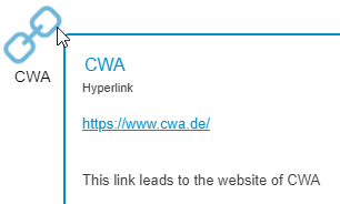 Hyperlink![]() | The Hyperlink object can be used to link to any target. This could be a section in SmartProcess (for example, a knowledge base article) or an external Web site. In the properties, you can enter a name, a description, and the URL to the target location. When the user points the mouse at the hyperlink object, a small window opens in which the user can view and click the link. ![]() |