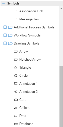 Folder Drawing Symbols | The Drawing Symbols folder is located in the symbol area of the Process designer. This folder contains a wide range of symbols that can be used in the process model. ![]() Except for a name that can be inserted in the middle of the object by double-clicking, these objects do not have any extended properties. The position, size and color of the text and the object can be adjusted according to the generally applicable formatting options. If you want to use additional symbols for process modeling, you can add them to the symbol area as user-defined images. |