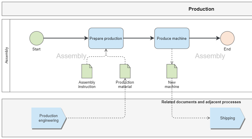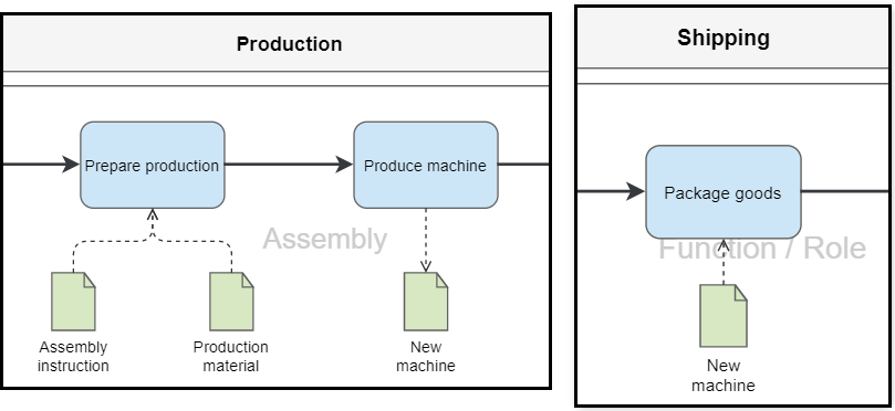 In the example, in the process 'Production', production materials and an assembly instruction are used as input to perform the task 'Prepare production'. In the subsequent task 'Produce machine' the output is the finished produced machine. In another process, 'Shipping', the created machine is used as input for the step 'Package goods'.