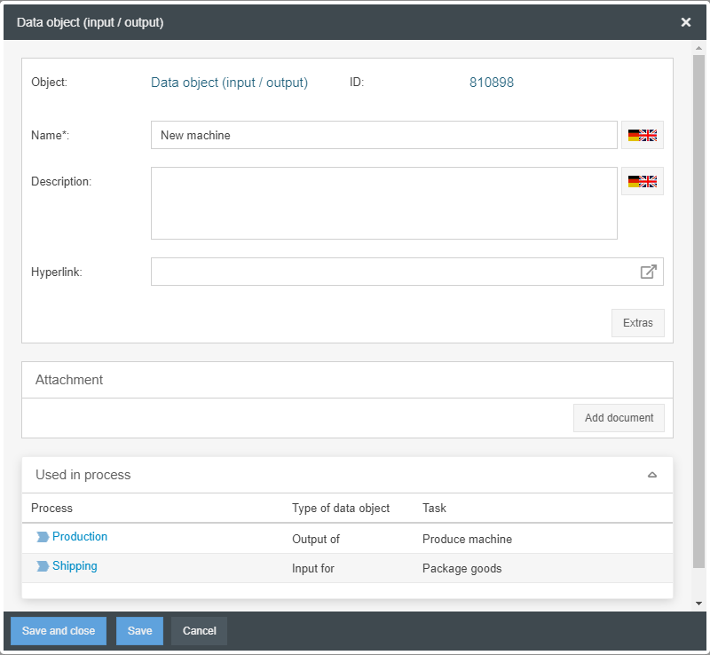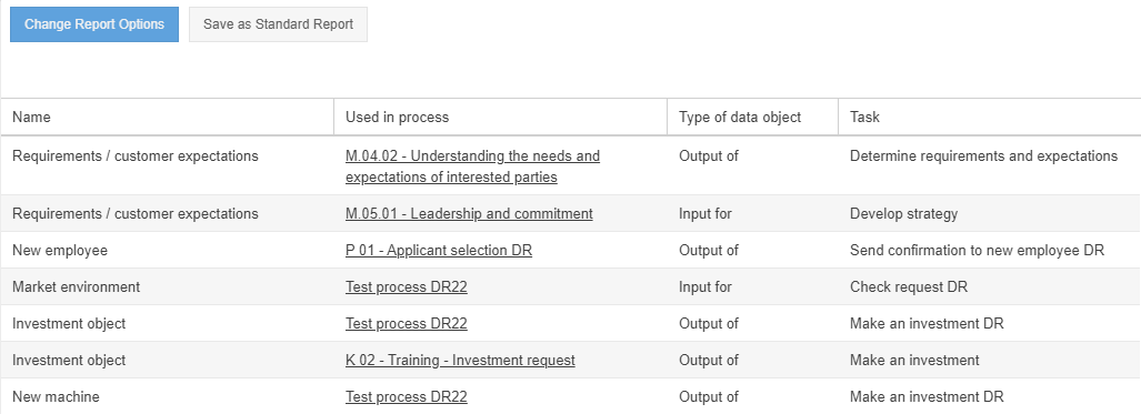 There you can see the interaction between the processes in the area 'Used in process'. It is listed exactly in which process the data object results as output from which task and is used in other processes as input for a specific task.