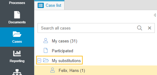 If the date fields are not or only partially filled in, the regulation comes into effect immediately and/or until further notice. The user's cases are listed for the representative in the cases menu in a separate "My substitutions" folder in the tree for cases with editing rights. The representative will also receive notifications about the user's new cases.