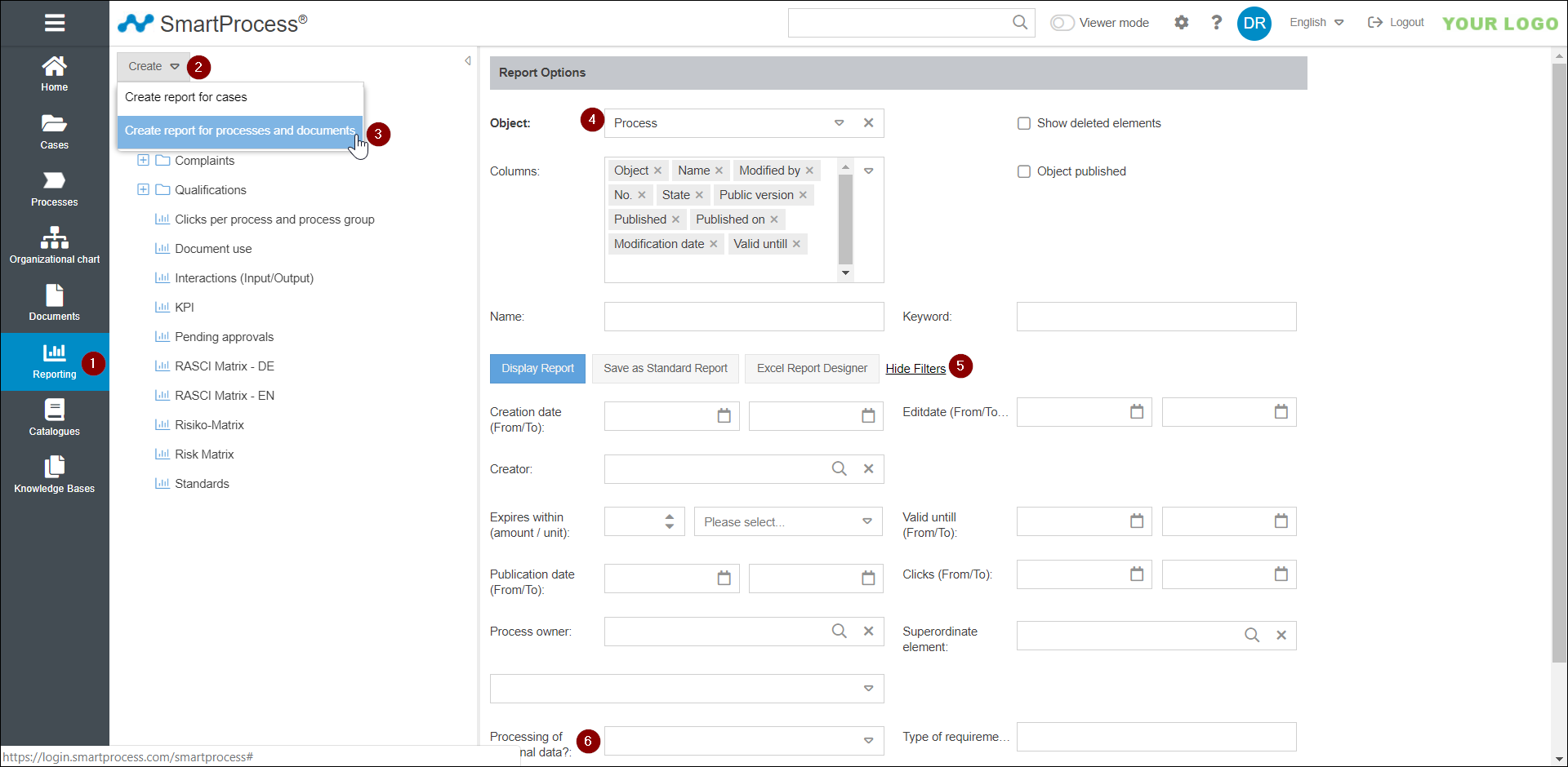 From the drop-down menu, select "Process" as the object (4) and use the link <Additional filters> (5) to display more filter options.