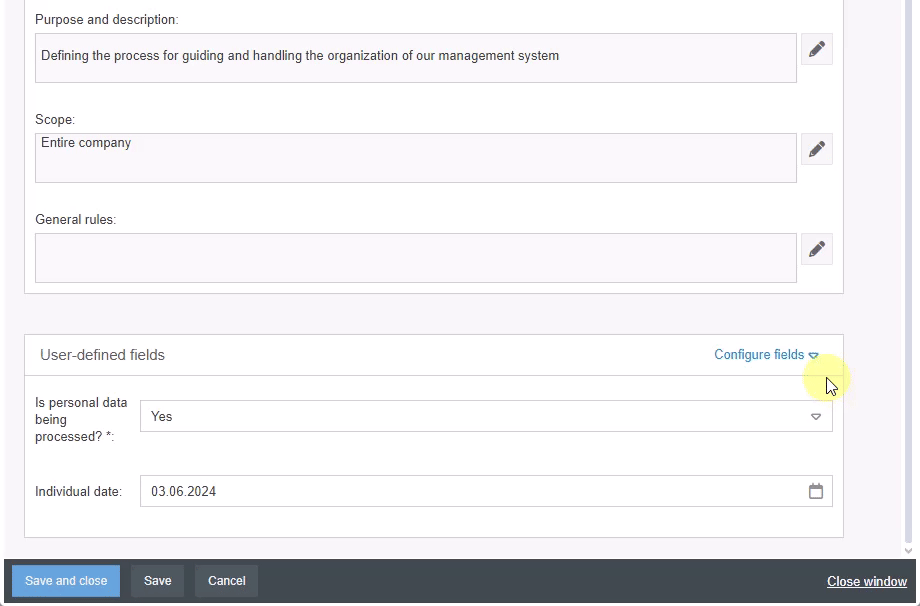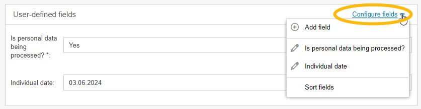 As soon as at least one field has been created, the area for user-defined fields is expanded. You can edit the existing fields via <Configure fields>.