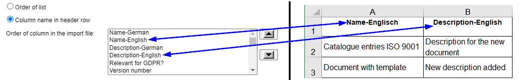 - Not every possible column must be specified in the import file. For example, if there is no column "Relevant for GDPR", the previous value in the field remains unchanged for all documents in the system.