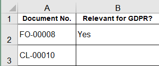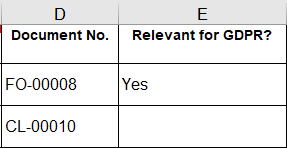In the example, the document with the number FO-00008 would have entered a value after the import. However, the document CL-00010 did not. If there were no "Relevant for GDPR" column in the Excel file, both documents would have no value in the corresponding field after the import.