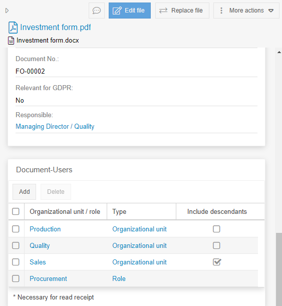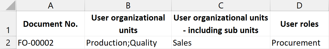 Document-Users | Multiple organizational units and roles can be added to the Document users list. For organizational units, there is an additional option to set a checkbox so that all subordinate organizational units are also considered as document users. For these different cases, 3 different columns are available during import. Several organizational units and roles can be imported per document in each column, separated by semicolons: