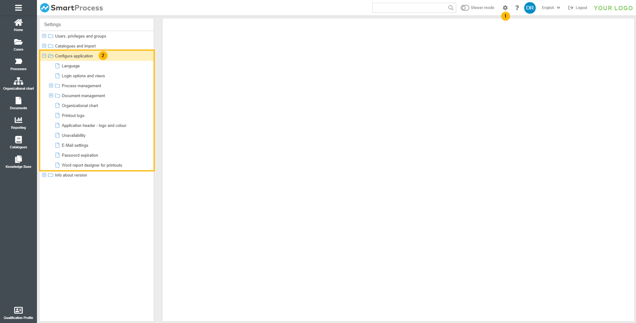Make default settings for process and document management. To do this, navigate to the Settings menu (1) and configure Process and Document Management options as required.