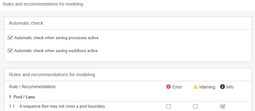 Here you will find all applicable modeling recommendations grouped by topic. You specify whether a rule should be applied and, if so, in which of the three categories (error, warning or info) a rule violation falls. Regardless of the category, the notes displayed in the Process Designer always have an informative character only. This means that saving the model is not prevented.