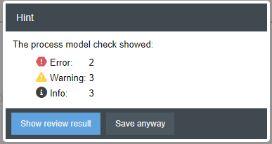 Here it is possible to specify whether, in addition to being called up manually, the check should also be performed automatically when process and/or workflow models are saved. The modelers can then decide whether they want to display the results in detail and fix the points, or whether they want to ignore them and save or exit the model.