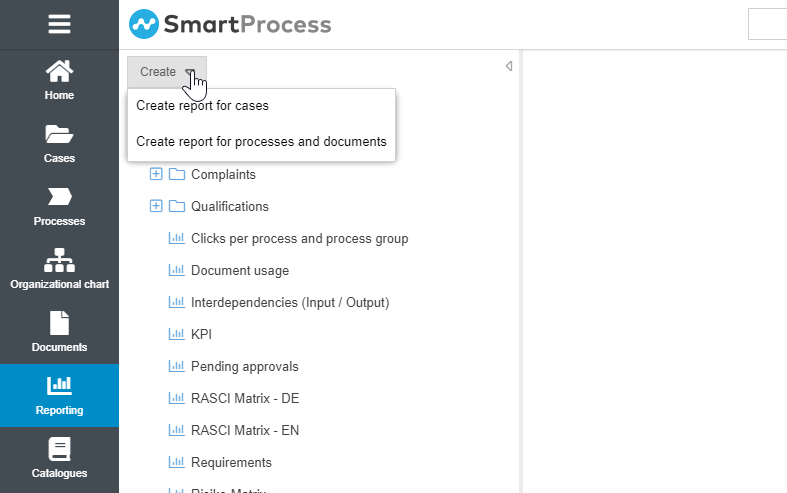 In the left area of the menu, the saved reports are listed and can be executed with a mouse click. To start a new report, click <Create>. In this drop-down menu, you can decide whether you want to run an evaluation for objects from process and document management or create a report for data from workflow cases and tasks instead.