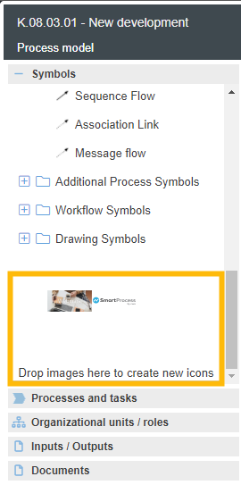 Add and delete custom images for all users under the icon palette in the process designer | If this option is enabled, users are allowed to add and remove image files at the bottom of the 'Symbols' tab in the Process designer. These image files can then be used by all users in process modeling. ![]() |