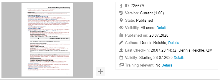 The view of the document details corresponds to the view for processes. To the left or above the master data, the file attached to the document is displayed as a preview, provided it is a Word, PDF, or image file.