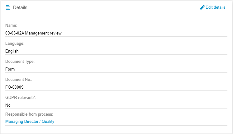 The item Training Relevant is only relevant if the standard application Qualification Management is used in SmartProcess. Training relevant documents are transferred to the qualification profile of document users, so that proof of qualification is required. With a click on <Details> the marking of the training relevance can be changed.
