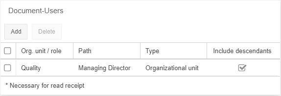 In the list of document users, any number of organizational units and roles from the organizational chart can be entered via <Add>. The system uses this assignment to determine which users the document is displayed to in the "My Documents" list and which users are notified by e-mail when a new version of the document is published.