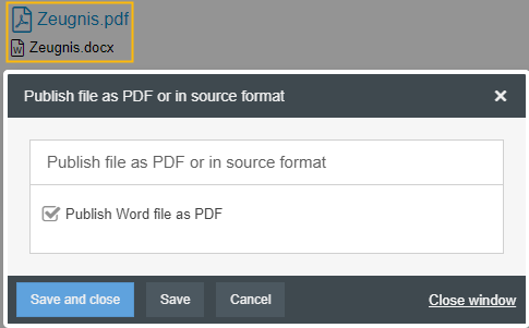 You can then determine for each document individually whether a Word attachment is made available to the viewer in the source Word format or as a read-only PDF file by choosing <Publish document as PDF or as source file>.