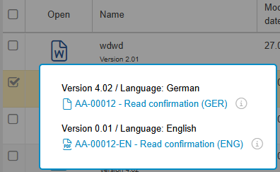 - Link to the file -> Similar to the previous point, this link opens the file attachment of the document in the displayed version number.