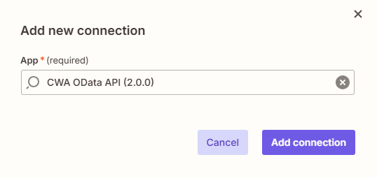 In the App field, you can search for the CWA OData API (2.0.0) by entering "cwa". Click on Add connection to set up the connection.