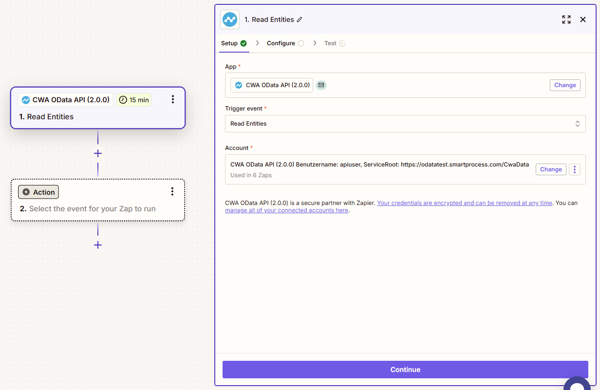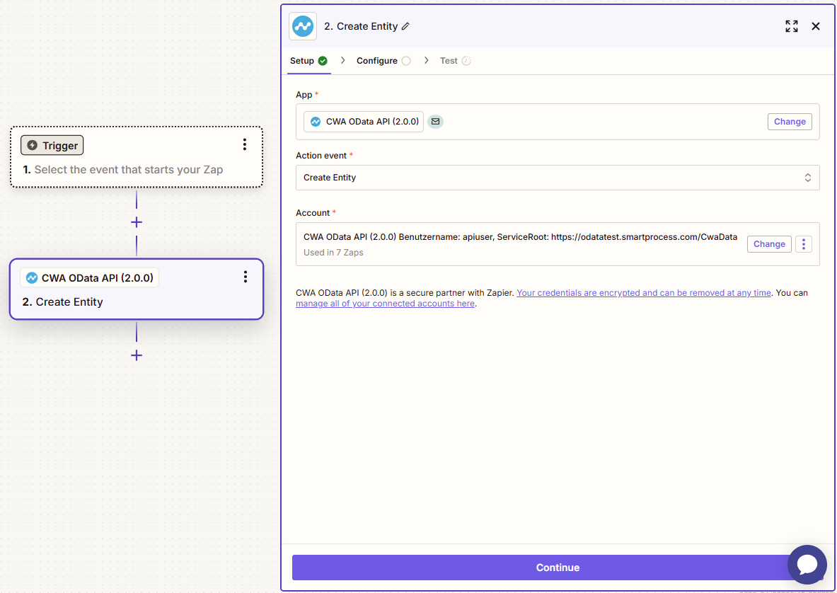 By clicking on Yes, Continue to CWA OData API (2.0.0), the API connection is created in Zapier and can be used in Zaps from now on.