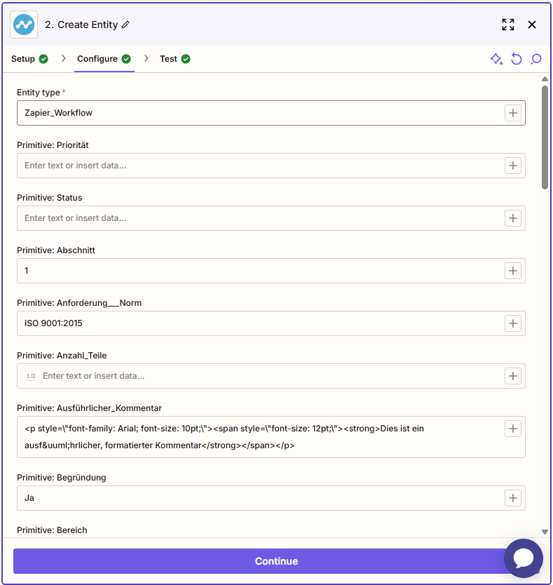 Zapier then requests that the trigger is activated once as a test to check whether the service (SmartProcess) is available and the trigger is configured correctly. If the test was successful, you will be offered up to three entities to choose from. Select the entity that best suits your use case (usually all three are suitable). The structure of the data returned here is available for the subsequent actions.