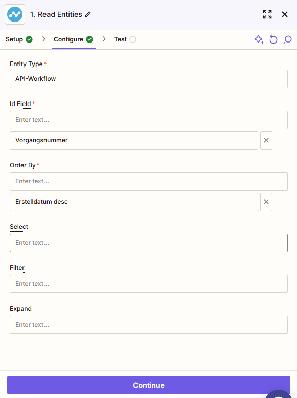 Firstly, fill in the "Entity Type" field. This could be the name of the workflow, for example. All fields that are linked to the selected entity then appear.