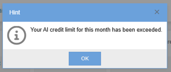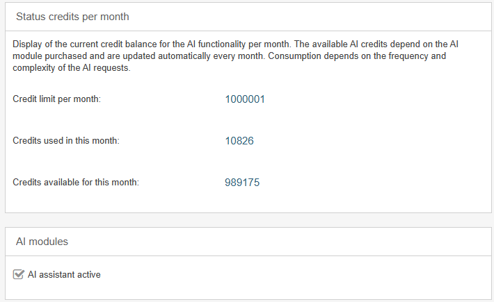 An overview of your credits for the AI function is displayed in this menu. Credits are the credit balance for using the AI function. Depending on the complexity of your request, different amounts of credits can be used. This depends, among other things, on the amount of data that is input or output.