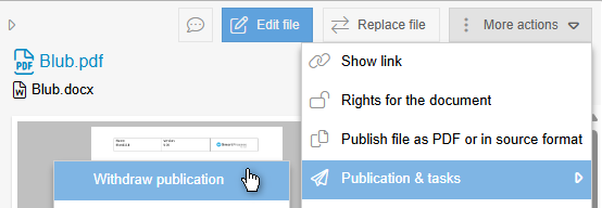 Withdraw and delete withdrawn documents | If this option is enabled, users can withdraw published documents, i.e. undo a publication: ![]() The deletion of withdrawn documents is also permitted. |