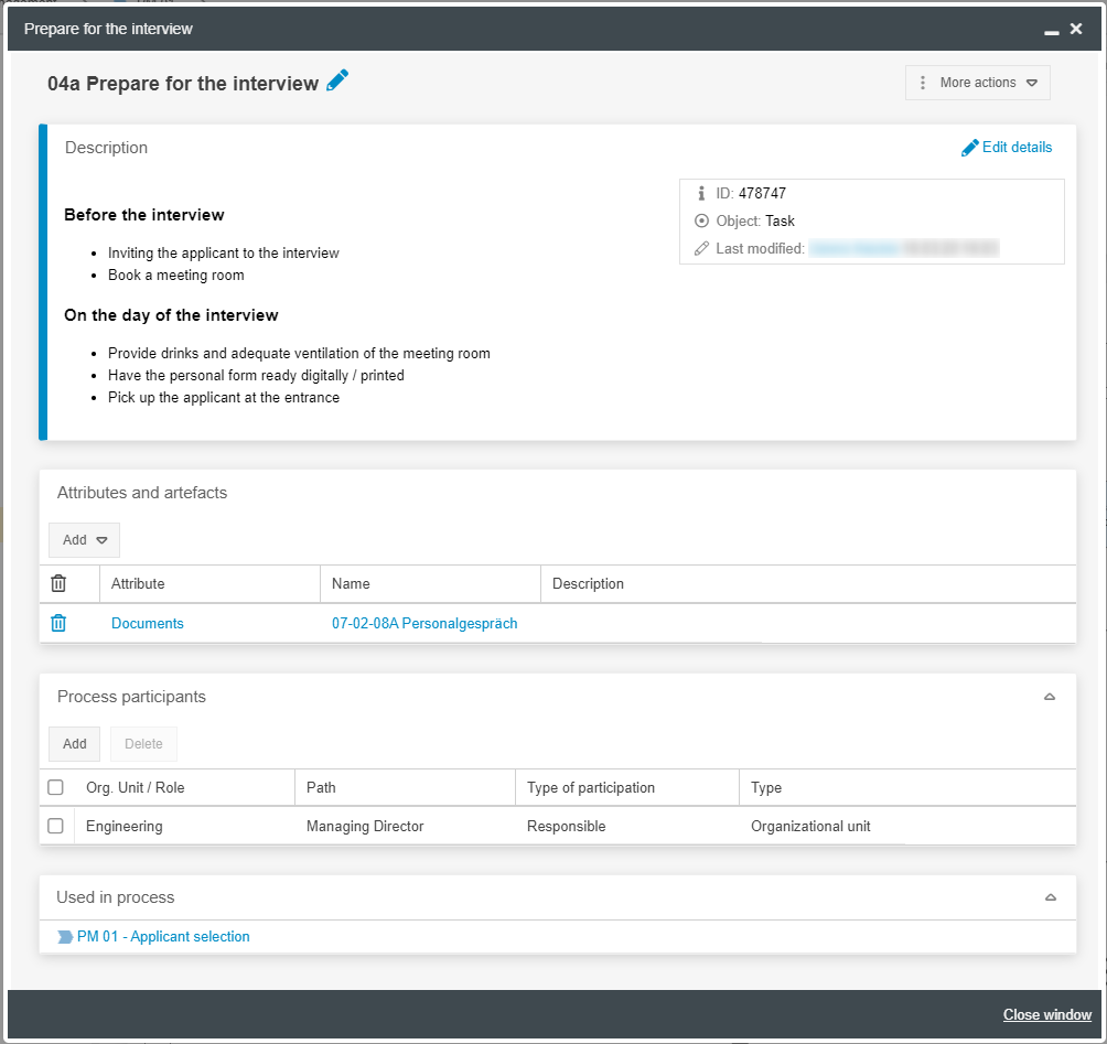 Attributes and artifacts | With <Add> in the Attributes and Artifacts area, various artifacts can be linked to the task. Which artifacts were linked to which task is also visible in the PDF template process description. |