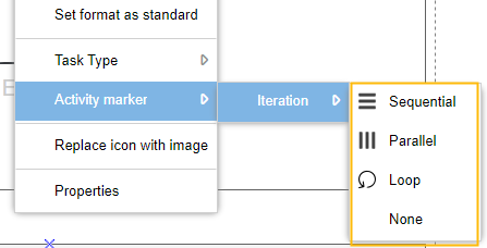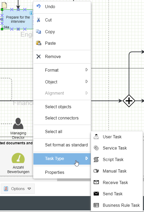 By right-clicking on the task in the process model, you can optionally select a task type to specify the kind of the task.