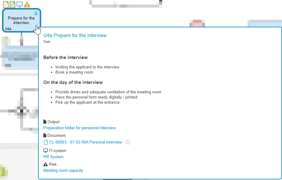 Description / Details | Via <Edit details> the name and numbering of the task can be changed. A detailed task description including images and links can be entered in an HTML text field. The small icon in the upper right corner of the task icon shows that a task description has been entered.The defined numbering is visible at the bottom left of the task icon. ![]() If the user points at a task with the mouse in the read-only view of the process, the description and artifacts linked to the task are shown without clicking on the task. |