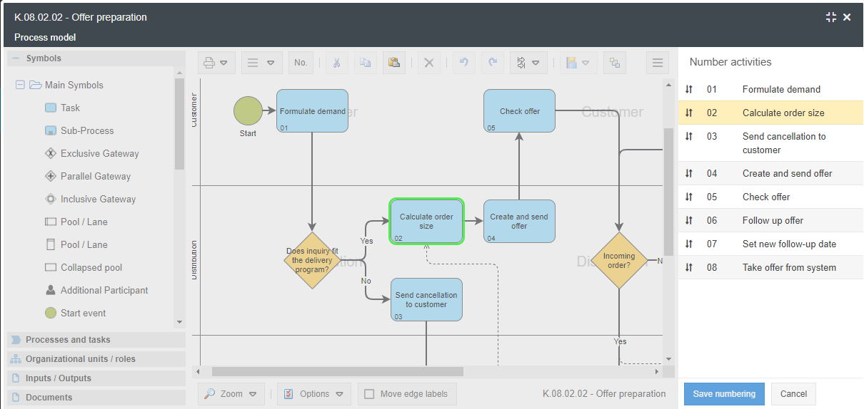 Numbering mode in the Process designer ![]() | By clicking on the <No.> button in the formatting bar of the Process designer, a list of all activities in the process model opens on the right-hand side of the screen. ![]() You can now drag and drop the tasks into the desired order. The currently selected task will be highlighted in the process model. You can accept the new numbering with <Save numbering> or discard it with <Cancel> and return to the previous state. The numbering made here can subsequently be overwritten again at any time via the manual numbering of the tasks. |