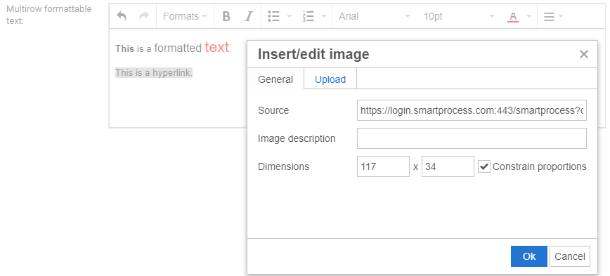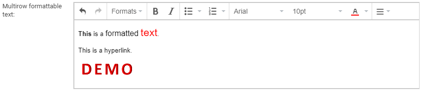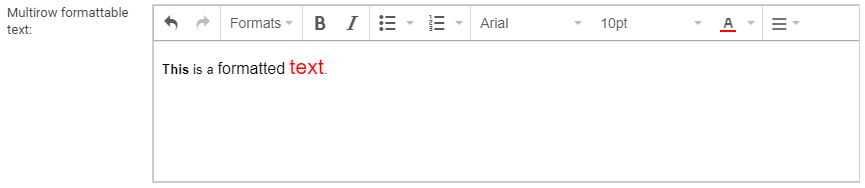 A field of type "Multirow formattable text" can be used to display a field in a case in which a multirow formattable text can be entered. This field uses a WYSIWYG editor.