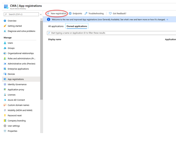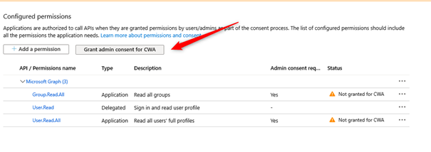 - Grant consent from administrator by clicking on <Grant admin consent for CWA>