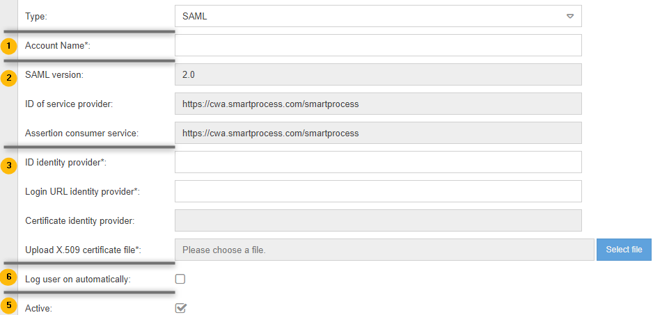 With SAML 2.0 (Security Assertion Markup Language) support for the cloud application, SmartProcess can be configured to use an external identity provider (IdP) to authenticate (single sign on) users by using SAML 2.0.