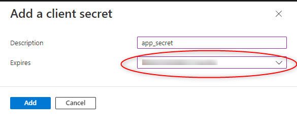 - Insert app_secret into the description field. Under 'Expires', select an expiration date that works for you. Before the expiration date, please create a new key and be sure to enter it in your Azure profile in SmartProcess so that the service is not disabled.