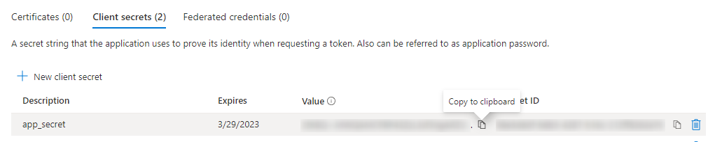 - Create a password for the App by navigating to menu Certificates & secrets and click <New client secret>.