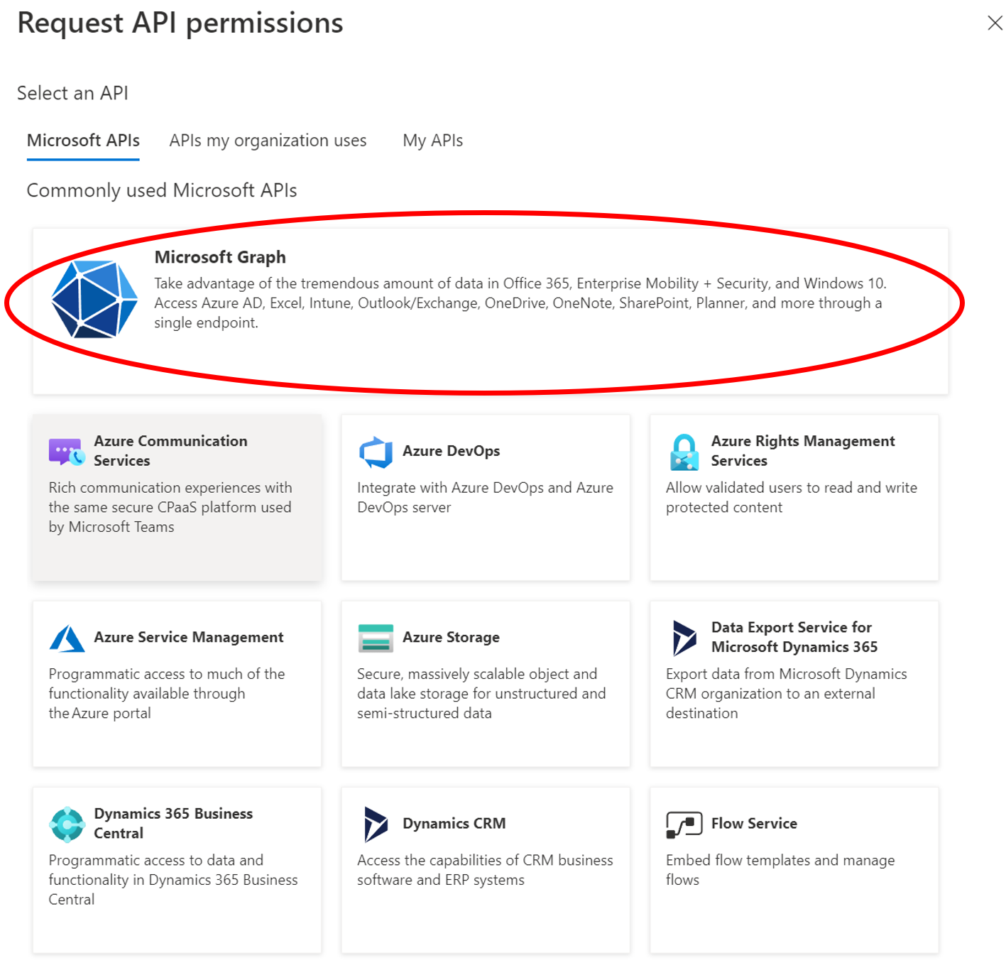 - In the Azure Portal, go to the API Permissions menu and select + Add new permission.