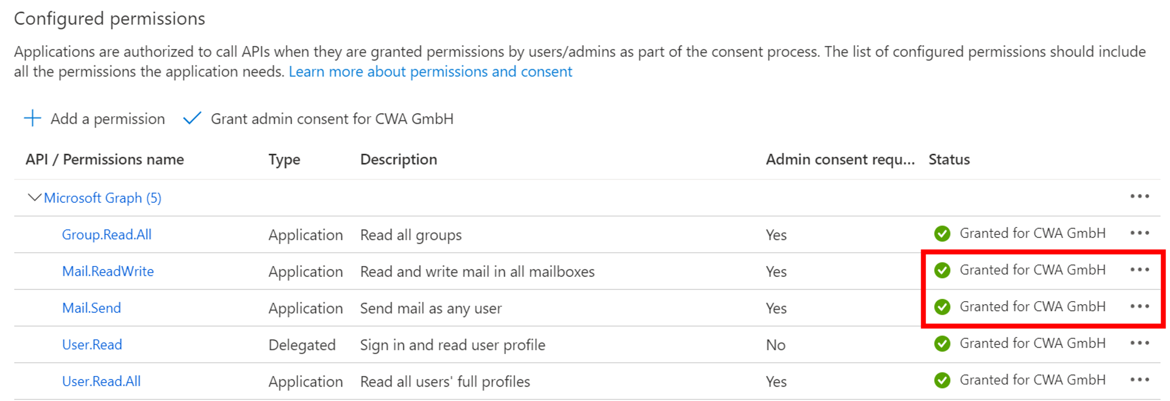 - In the subsequent overview, select Grant admin consent for "CWA GmbH"