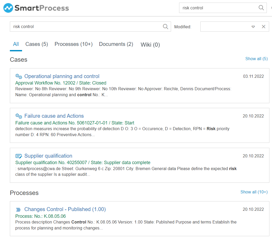General. The full text search in the application header allows you to search several menus simultaneously for keywords. These include: Process groups, processes and tasks. Documents. Cases. Wiki. All…