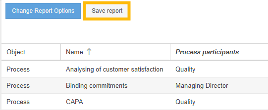 A saved report can be used, for example, to regularly check whether artifacts with the same name were accidentally created twice in the process modeling or how many complaint cases were created in the previous month.
